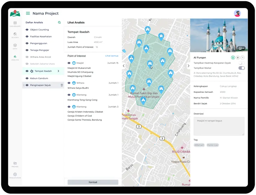 Dengan Kazee Maps Analytics, Anda dapat dengan bebas menandai suatu area atau titik dan memberikan informasinya area atau titik itu dan Anda dapat menganalisisnya.